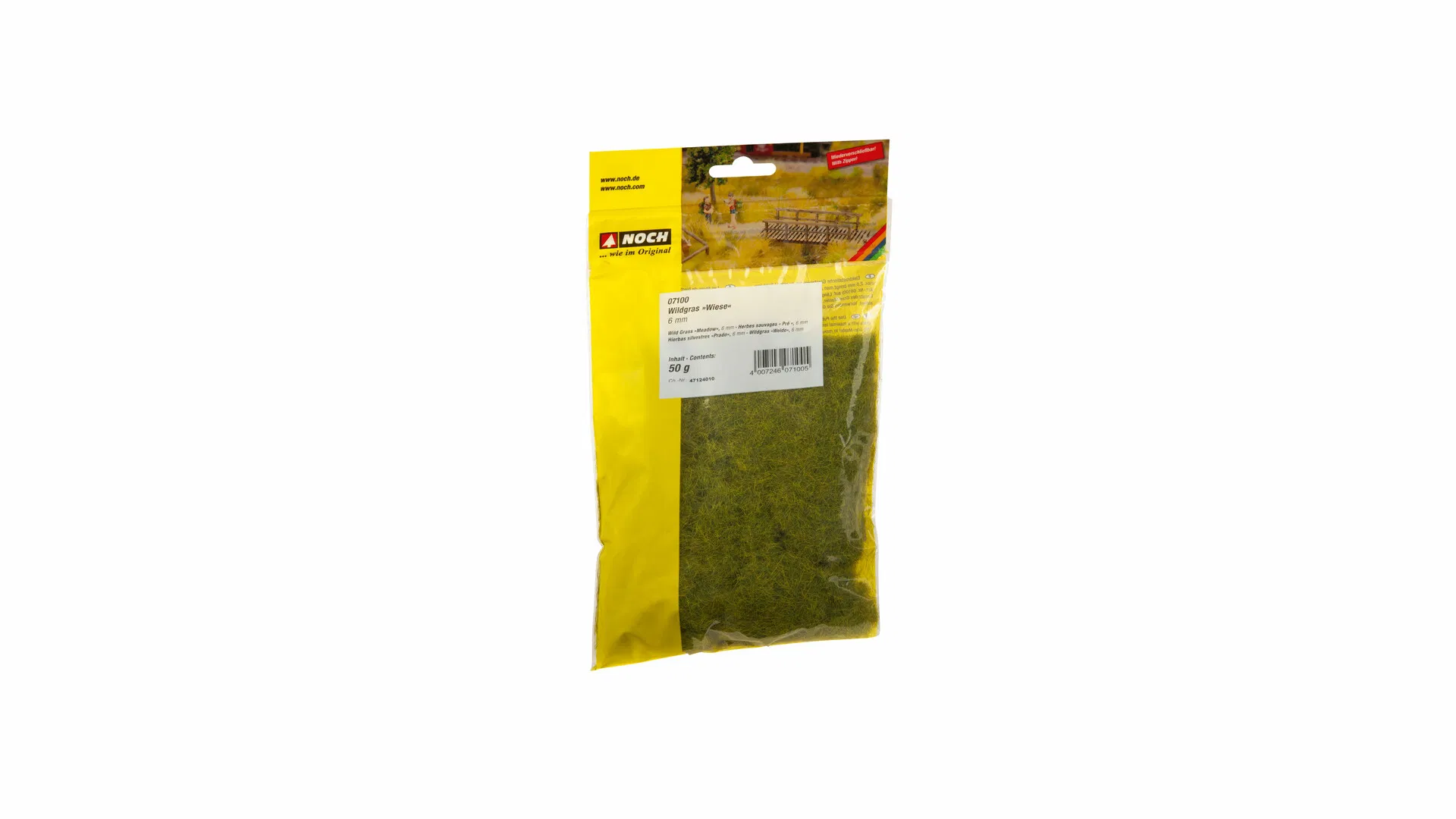 Iarba „Wild Grass” de 6 mm este ideală pentru redarea realistă a zonelor cu vegetație înaltă: pajiști, câmpuri, maluri și terasamente. Fibrele de iarbă pot fi aplicate optim cu ajutorul dispozitivului „Gras-Master”. Ambalajul este practic, cu bandă de fixare, ce previne vărsarea.
