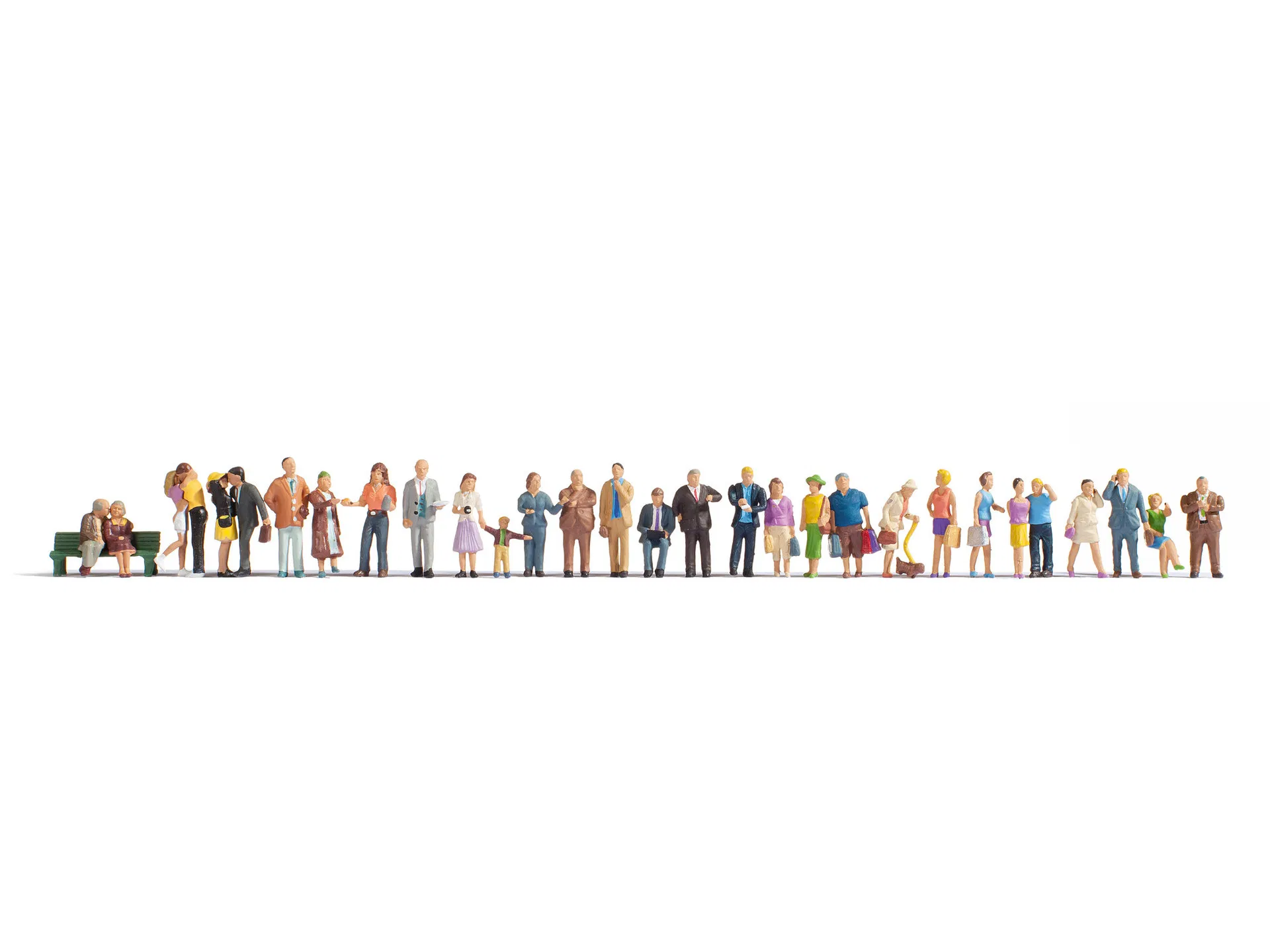 Setul conține 30 de figurine H0 pictate manual, cu poziții variate (în picioare, așezate), oferind un nivel ridicat de realism pentru orice dioramă urbană.